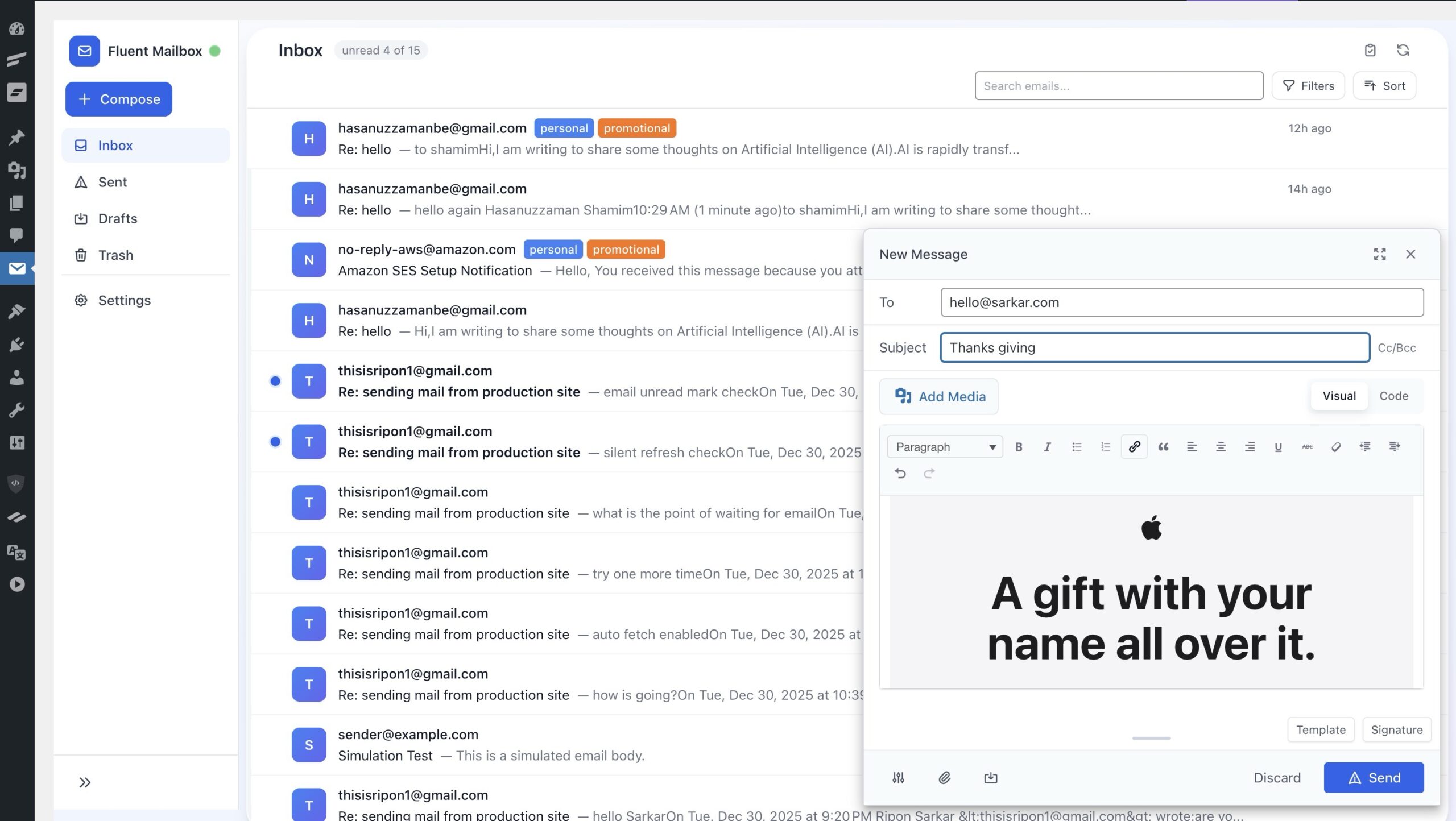 A fast, Gmail-like interface designed for productivity inside your admin panel.